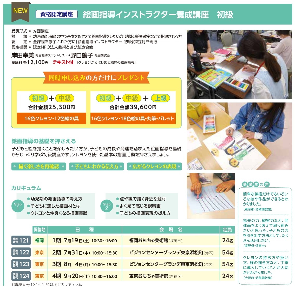 | 講座番号:121 | 講座名: 絵画指導インストラクター養成講座 初級 テキスト付 | 日時:10:30~16:00 |