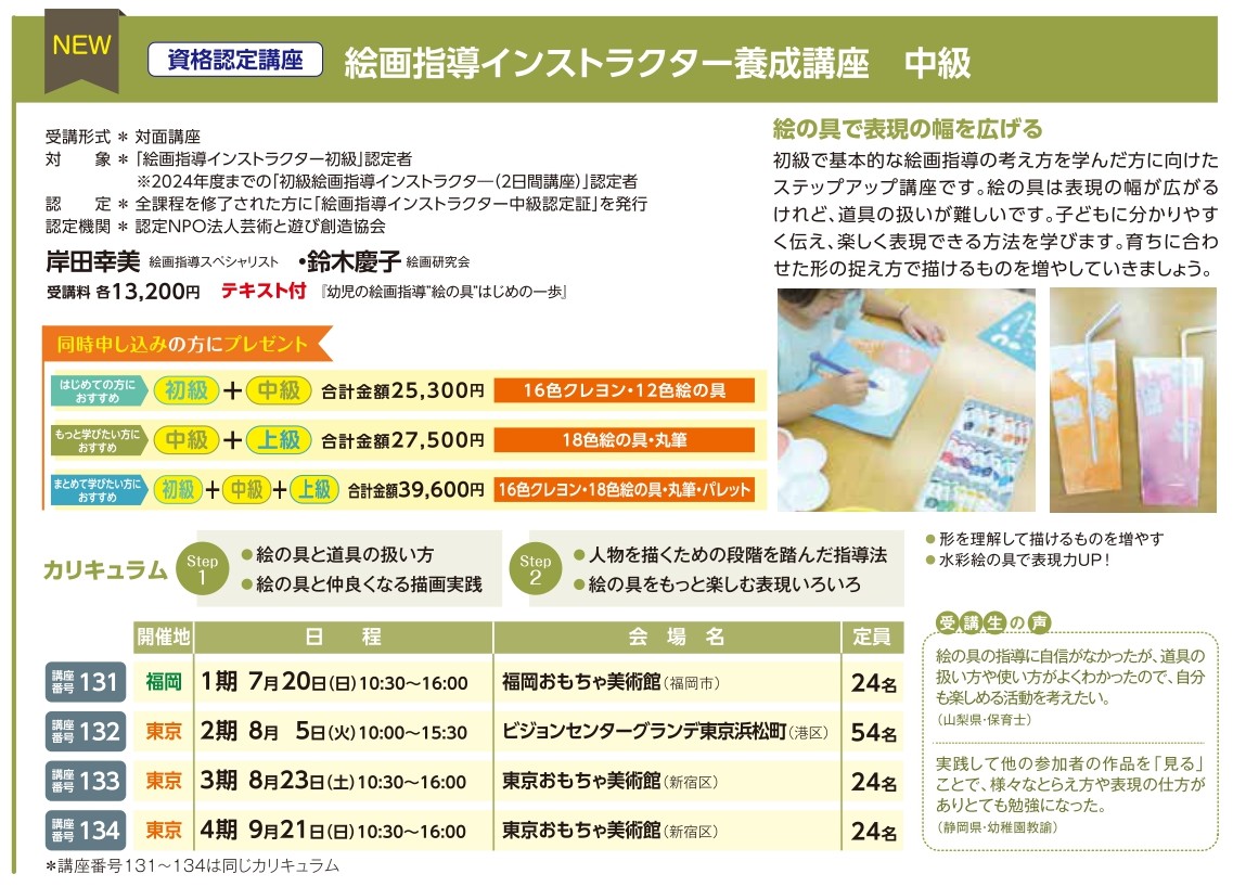 | 講座番号:131 | 講座名: 絵画指導インストラクター養成講座 中級 テキスト付 | 日時:10:30~16:00 |