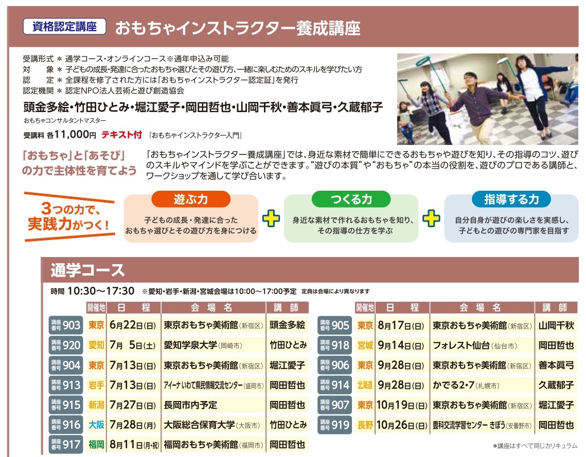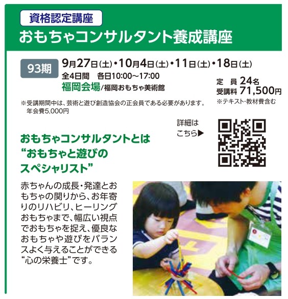 | 講座番号:TC093 | 講座名: おもちゃコンサルタント養成講座 福岡93期 | 日時:各日10:00~17:00 |