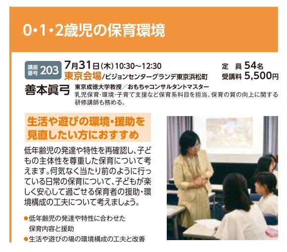 | 講座番号:203 | 講座名: 0・1・2歳児の保育環境 | 日時:10:30~12:30 |