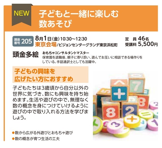 | 講座番号:205 | 講座名: 子どもと一緒に楽しむ数あそび | 日時:10:30~12:30 |