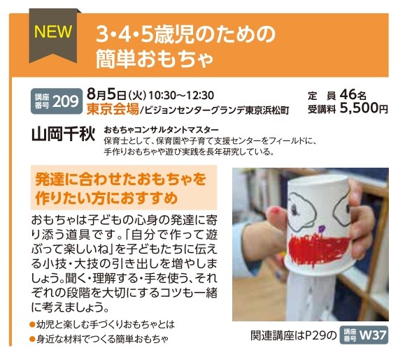| 講座番号:209 | 講座名: 3・4・5歳児のための簡単おもちゃ | 日時:10:30~12:30 |