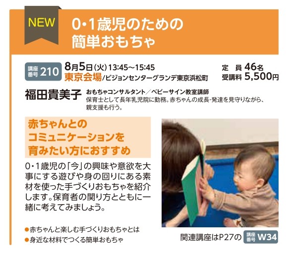 | 講座番号:210 | 講座名: 0・1歳児のための簡単おもちゃ | 日時:13:45~15:45 |