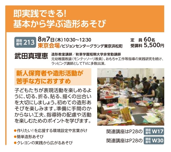 | 講座番号:213 | 講座名: 即実践できる!基本から学ぶ造形あそび | 日時:10:30~12:30 |