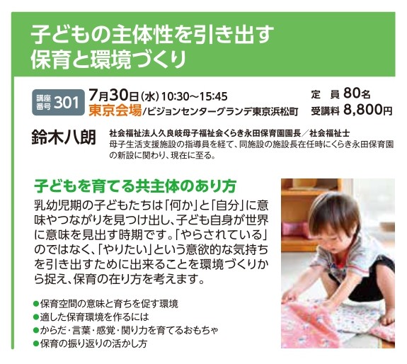 | 講座番号:301 | 講座名: 子どもの主体性を引き出す保育と環境づくり | 日時:10:30~15:45 |