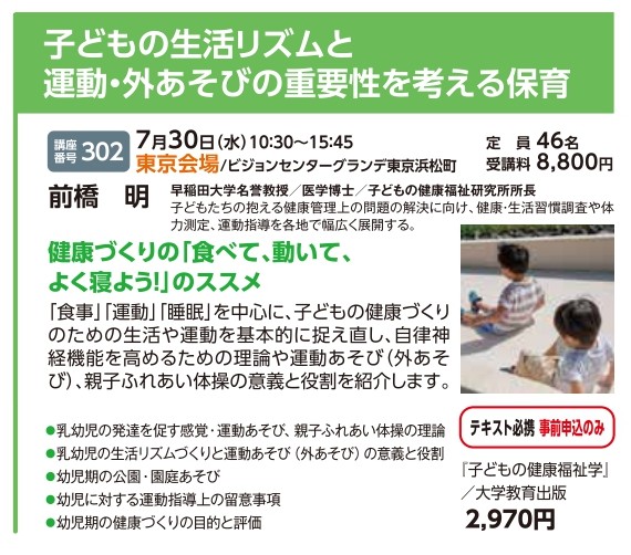 | 講座番号:302 | 講座名: 子どもの生活リズムと運動・外あそびの重要性を考える保育 | 日時:10:30~15:45 |