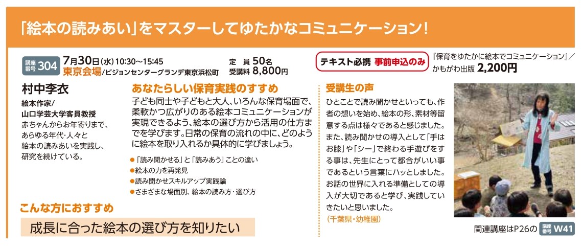 | 講座番号:304 | 講座名: 「絵本の読みあい」をマスターしてゆたかなコミュニケーション! | 日時:10:30~15:45 |
