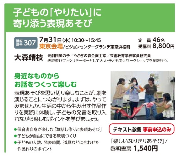 | 講座番号:307 | 講座名: 子どもの「やりたい」に寄り添う表現あそび | 日時:10:30~15:45 |