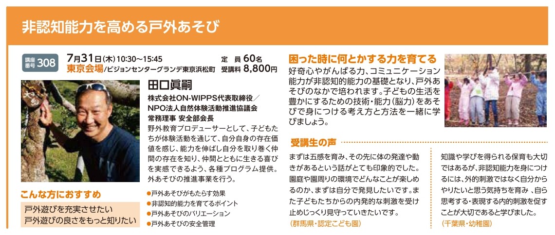 | 講座番号:308 | 講座名: 非認知能力を高める戸外あそび | 日時:10:30~15:45 |
