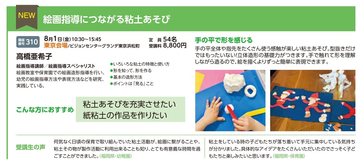 | 講座番号:310 | 講座名: 絵画指導につながる粘土あそび | 日時:10:30~15:45 |