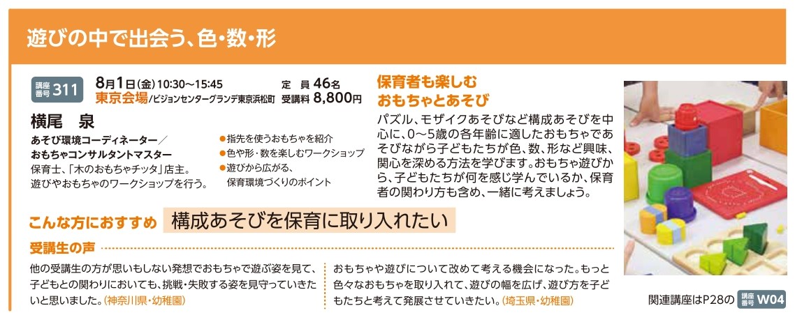 | 講座番号:311 | 講座名: 遊びの中で出会う、色・数・形 | 日時:10:30~15:45 |