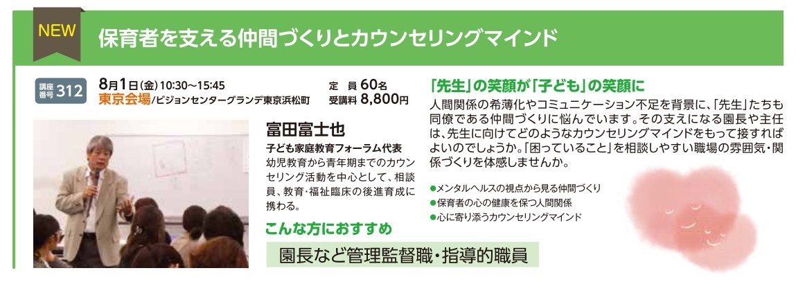 | 講座番号:312 | 講座名: 保育者を支える仲間づくりとカウンセリングマインド | 日時:10:30~15:45 |