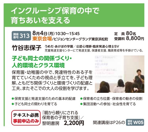 | 講座番号:313 | 講座名: インクルーシブ保育の中で育ちあいを支える | 日時:10:30~15:45 |