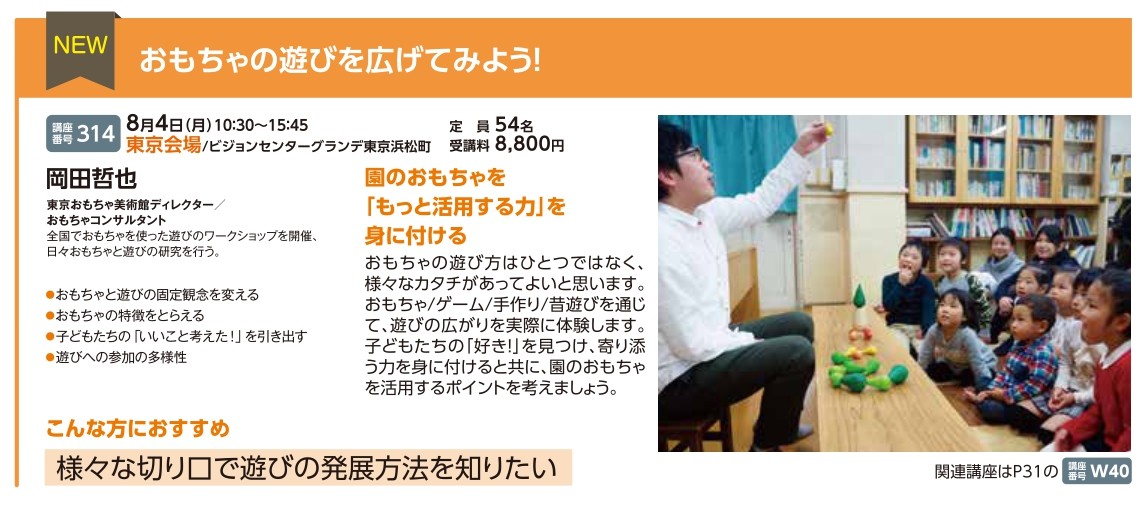 | 講座番号:314 | 講座名: おもちゃの遊びを広げてみよう! | 日時:10:30~15:45 |