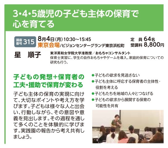 | 講座番号:315 | 講座名: 3・4・5歳児の子ども主体の保育で心を育てる | 日時:10:30~15:45 |