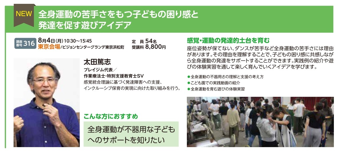 | 講座番号:316 | 講座名: 全身運動の苦手さをもつ子どもの困り感と発達を促す遊びアイデア | 日時:10:30~15:45 |