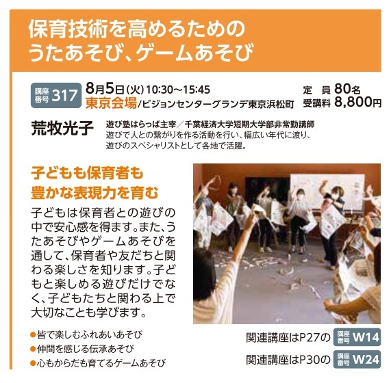 | 講座番号:317 | 講座名: 保育技術を高めるためのうたあそび、ゲームあそび | 日時:10:30~15:45 |