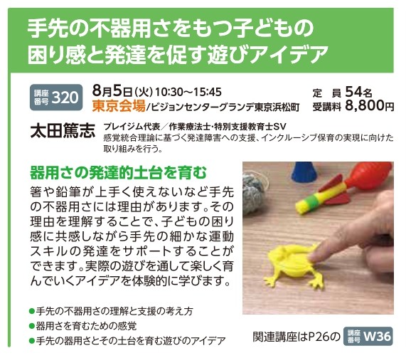 | 講座番号:320 | 講座名: 手先の不器用さをもつ子どもの困り感と発達を促す遊びアイデア | 日時:10:30~15:45 |