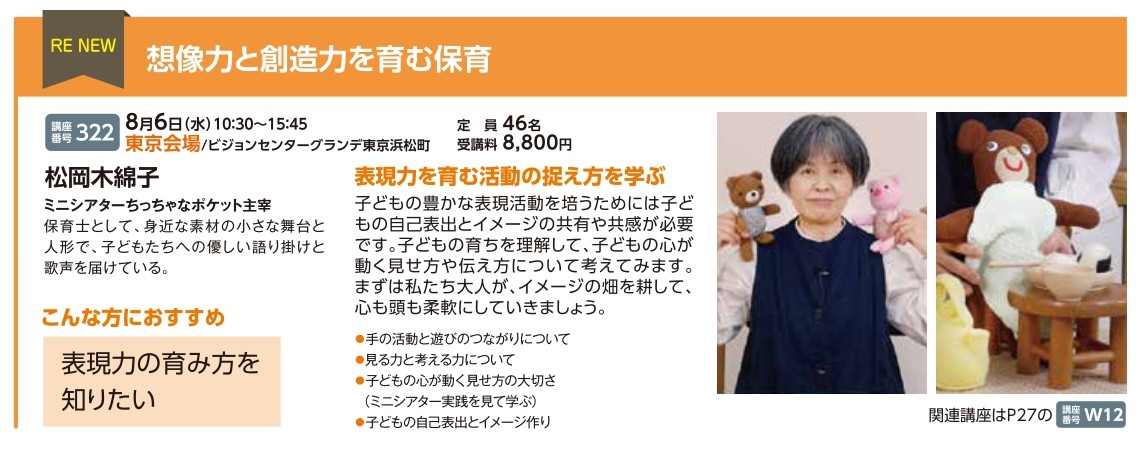 | 講座番号:322 | 講座名: 想像力と創造力を育む保育 | 日時:10:30~15:45 |