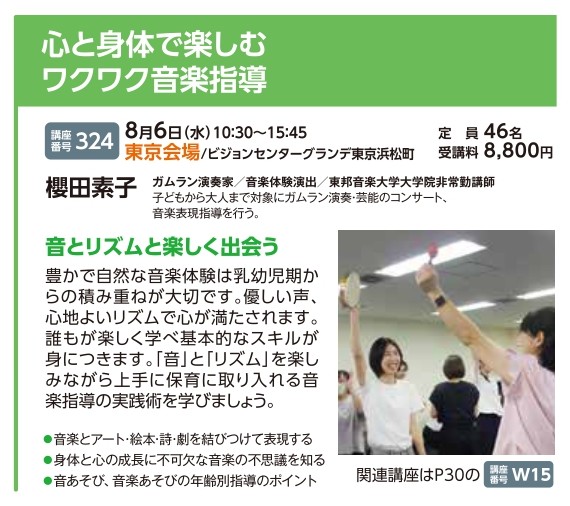 | 講座番号:324 | 講座名: ⼼と⾝体で楽しむワクワク⾳楽指導 | 日時:10:30~15:45 |