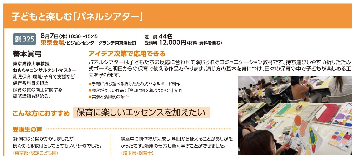 | 講座番号:325 | 講座名: 子どもと楽しむ「パネルシアター」 | 日時:10:30~15:45 |