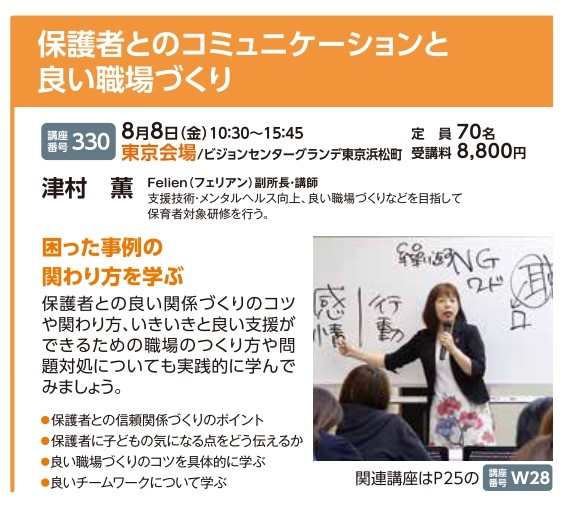 | 講座番号:330 | 講座名: 保護者とのコミュニケーションと良い職場づくり | 日時:10:30~15:45 |
