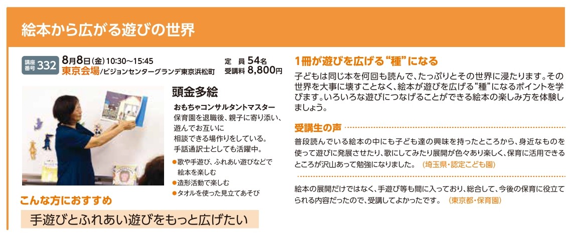 | 講座番号:332 | 講座名: 絵本から広がる遊びの世界 | 日時:10:30~15:45 |