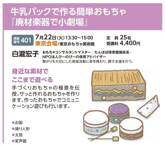 | 講座番号:401 | 講座名: 牛乳パックで作る簡単おもちゃ『廃材楽器で小劇場』 | 日時:13:30~15:00 |