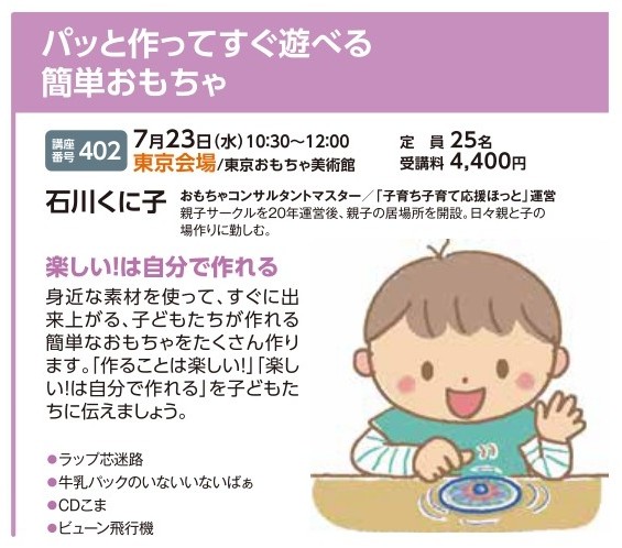 | 講座番号:402 | 講座名: パッと作ってすぐ遊べる簡単おもちゃ | 日時:10:30~12:00 |