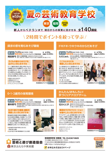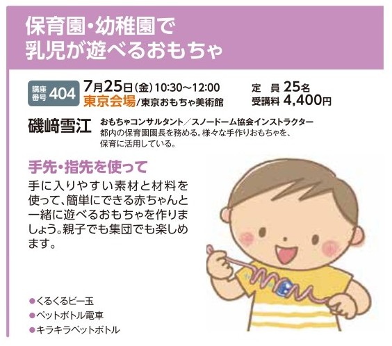 | 講座番号:404 | 講座名: 保育園・幼稚園で乳児が遊べるおもちゃ | 日時:10:30~12:00 |