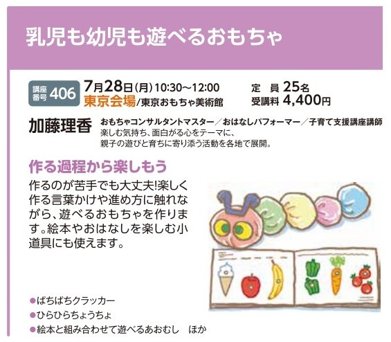 | 講座番号:406 | 講座名: 乳児も幼児も遊べるおもちゃ | 日時:10:30~12:00 |