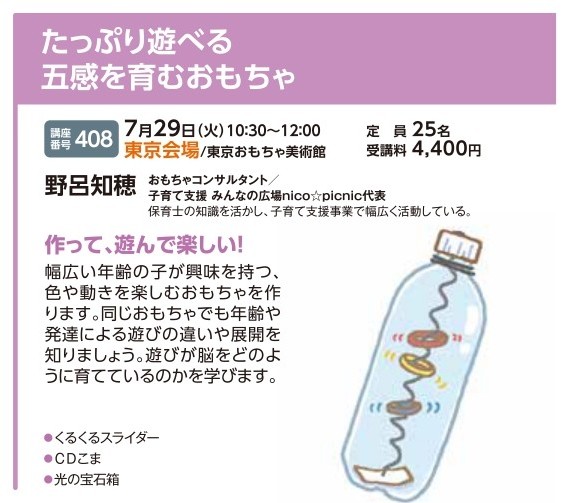 | 講座番号:408 | 講座名: たっぷり遊べる五感を育むおもちゃ | 日時:10:30~12:00 |